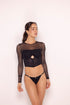 El top de manga larga en malla translúcida crea un efecto de segunda piel que aporta ligereza y sofisticación, mientras su estructura tipo corset estiliza la figura y define la cintura de forma natural. El detalle frontal con abertura sutil y herraje dorado añade un punto de sensualidad elegante, elevando el diseño sin excesos.