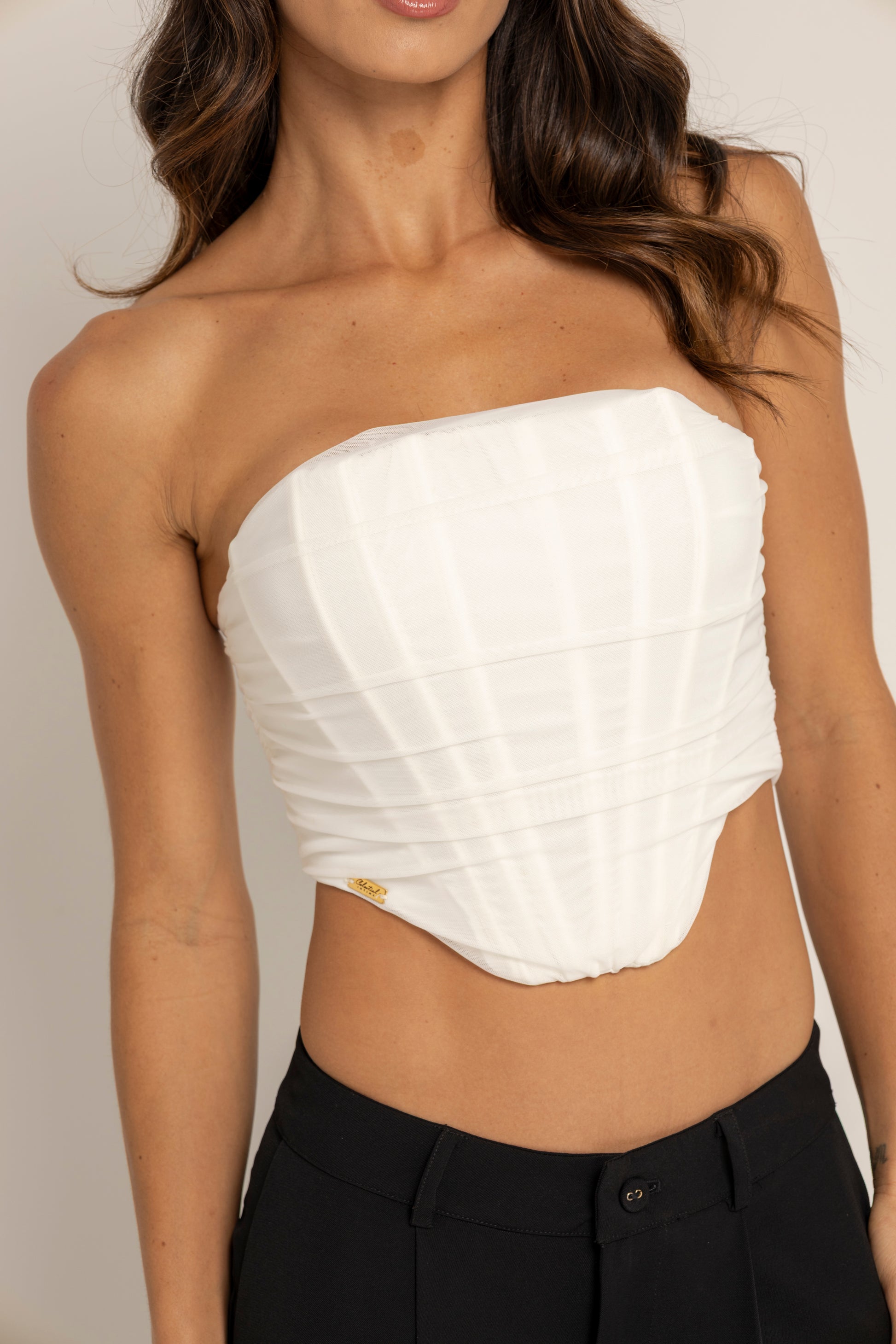 El corpiño Nara es una pieza icónica que redefine la elegancia y la sensualidad femenina. Diseñado con una silueta strapless que resalta los hombros y el escote, combina la estructura clásica del corset con la suavidad del drapeado, logrando una fusión perfecta entre sofisticación y comodidad.